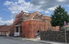 Veškeré dřevěné střešní konstrukce jak přední část, tak i zadní část s prostředním objektem, vykazovaly značné poškození dřevokaznými houbami a hmyzem. Bylo rozhodnuto o jejich demontáži a o náhradě střešních konstrukcí novými dřevěnými prvky. A to bylo právě předmětem naší realizace. V prostřední části původní tělocvičny z obloukových sbíjených nosníků bylo rozhodnuto o náhradě pouze jednoho kusu obloukového nosníku. Ten byl nahrazen lepeným BSH obloukovým nosníkem se stojkami pro vytvoření sedlového tvaru střechy. Stojky byly délkově zařezaný na stavbě, aby bylo zabezpečeno napojení původního tvaru střechy, na nově realizovanou část, což se tímto postupem zabezpečilo.