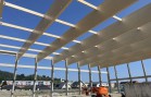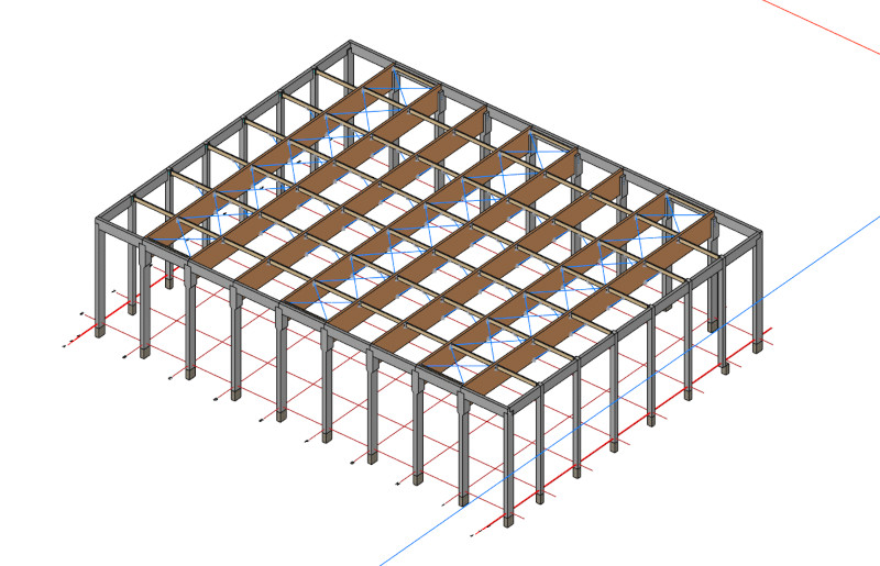 Ztužení konstrukce ve střešní rovině zajišťují ocelová táhla a rovněž tak hlavní nosníky jsou zabezpečeny proti klopení systémem ocelových táhylek. Takto zrealizovaná střešní konstrukce