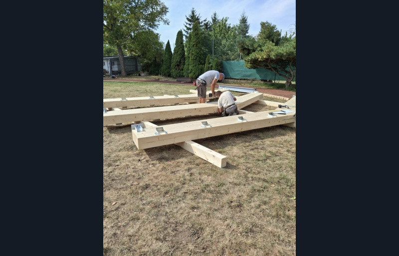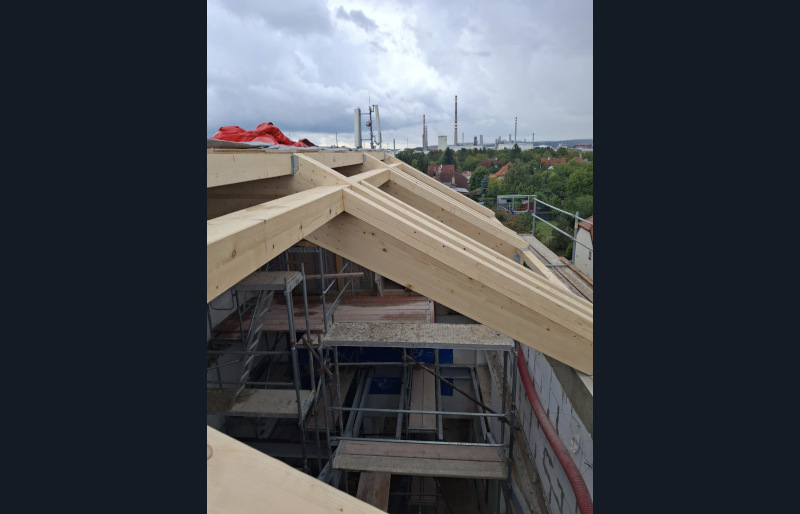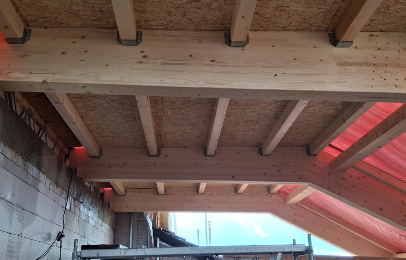Střešní lomená vazníková konstrukce složená ze třech lepených přímých BSH nosníků s montážním spojem pomocí ocelového plechu a kolíků a doplněná o dřevěné KVH krokve byla předmětem naší dodávky na této stavbě.